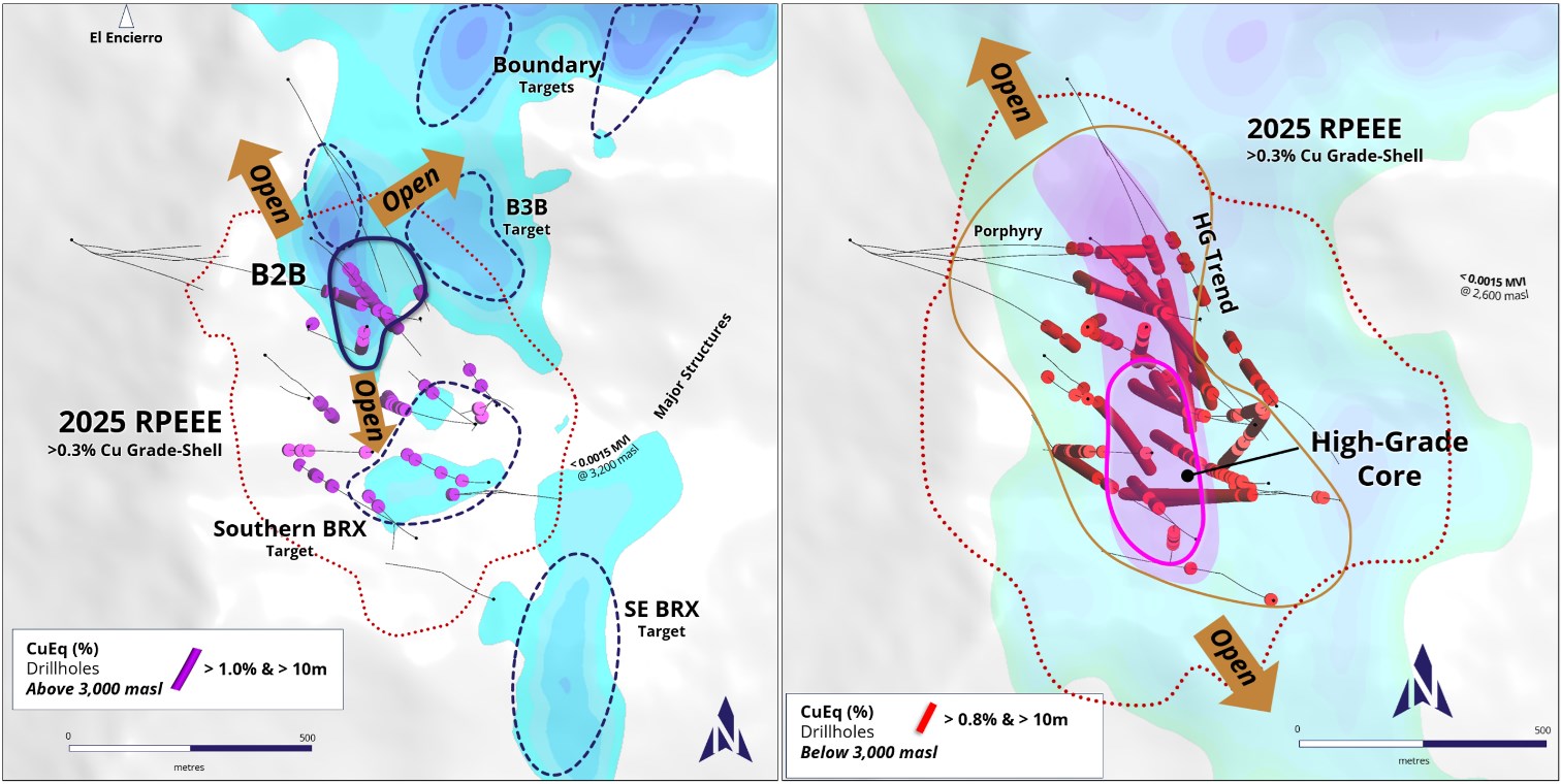 A key objective of the upcoming program is to further delineate the high-grade B2B Zone, which has demonstrated high-grade intercepts and continuity in Phase V. Drilling will focus on expanding the zone to the north-northeast, where step-outs have confirmed both size and scale, but limits remain undefined. Continued success in this direction has the potential to materially increase the volume of high-grade mineralization within Valeriano, enhancing both the overall grade profile and the strategic importance of the B2B Zone within the broader porphyry system.
